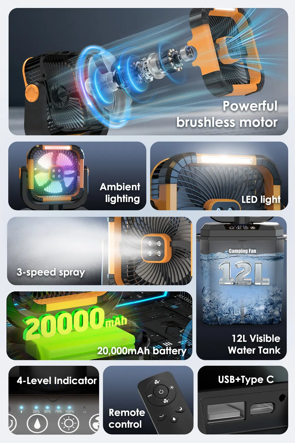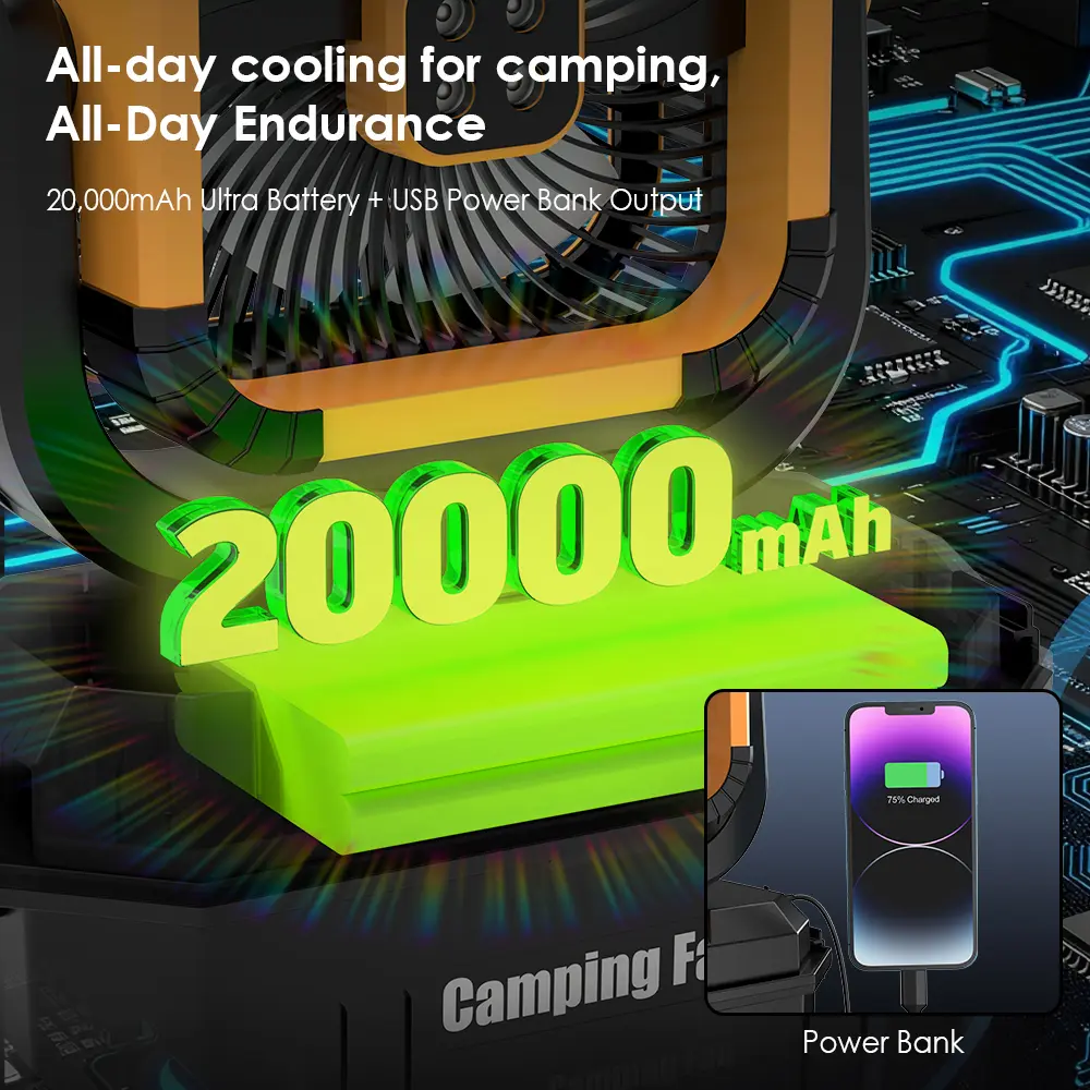 • 🌈 Modo de iluminação dinâmica: 3 níveis de luz LED branca + luz ambiente RGB com mudança automática — perfeito para ambientes noturnos ou iluminação de barraca.