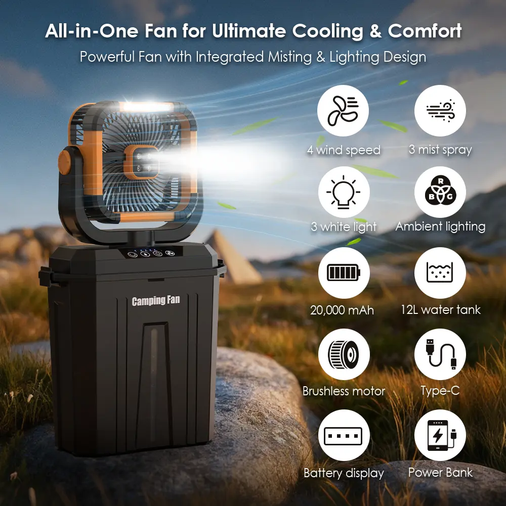 It combines strong airflow, cool mist, and atmospheric lighting in one compact design — made for real outdoor use.